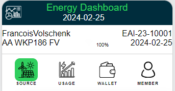 The dashboard integrates the Energy sources, Consumption or usage, a wallet to manage financial transactions and membership to create a common platform for suppliers and consumers.